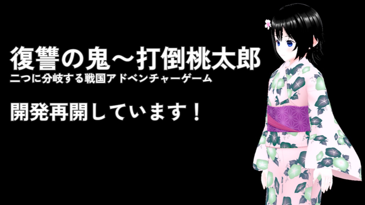 半年前に一旦ゲーム開発がストップしましたが、最近は毎日パソコンに向かって「復讐の鬼〜打倒桃太郎 二つに分岐する戦国アドベンチャーゲーム」を開発しています。リリースはまだ先ですが、ちゃんと復帰できてホッとしています。YouTubeには動画、Ci-enにも復帰の記事をそれぞれ公開しました。引き続き取り組んでまいります!